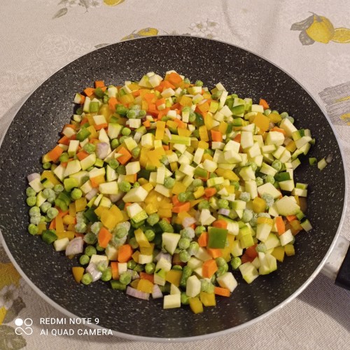 Un peperone, una zucchina, una carota, una cipolla ( o scalogno), una manciata di piselli (surgelati vanno benissimo). (Se le dimensioni delle verdure sono piccole, aumentate a due la quantità, e se avete in casa altre verdure aggiungetele pure (io avevo un piccolo peperone verde oltre a quello giallo e l’ho aggiunto) .