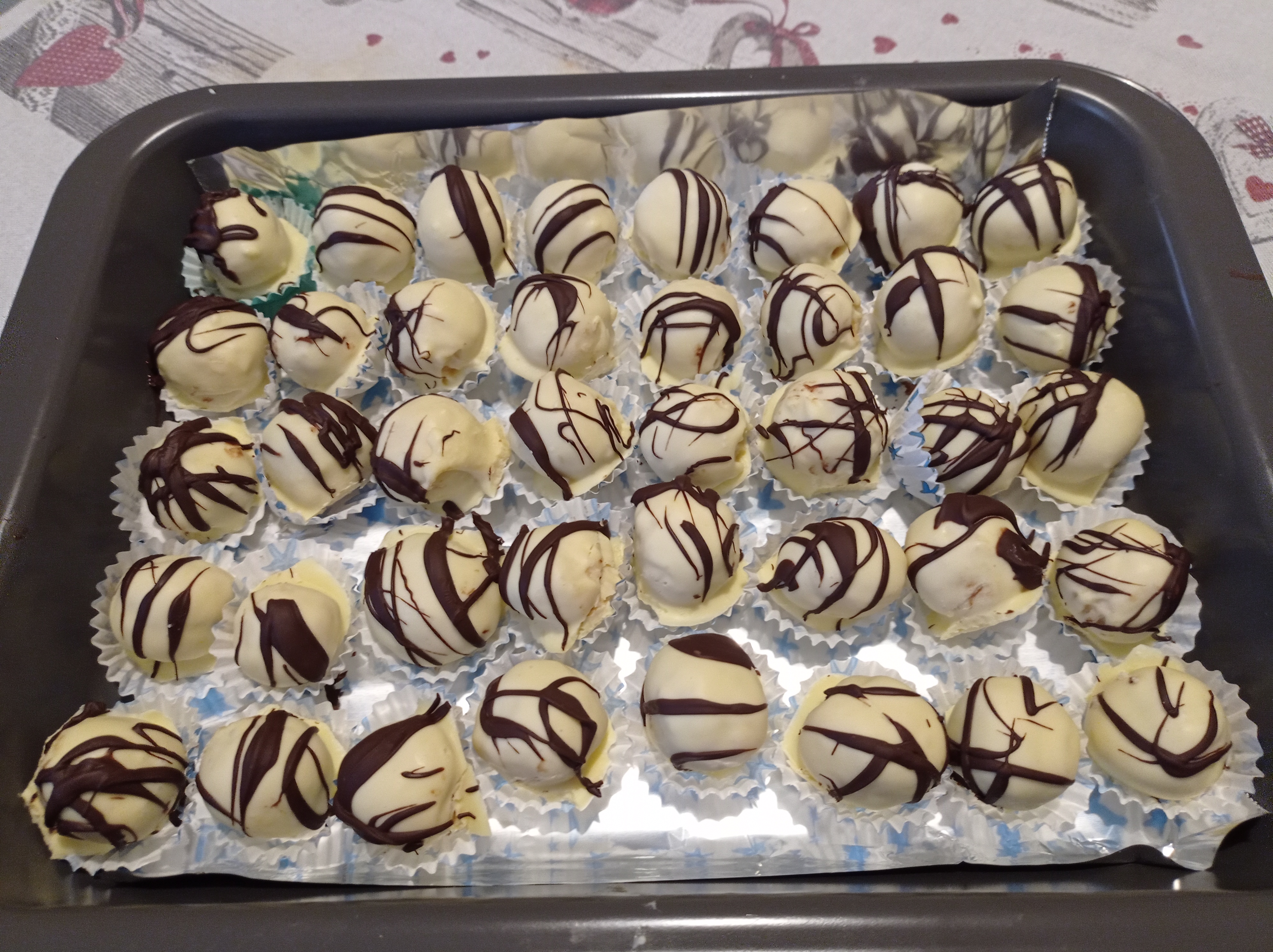 Lasciatelo leggermente intiepidire prima di immergerci i dolcetti con l’aiuto di una forchetta . Muovete la forchetta per eliminare il cioccolato in eccesso e appoggiate i dolcetti sulla carta da forno. Riponete in frigorifero per circa 10/15 minuti per fare indurire il cioccolato bianco. Quando il cioccolato bianco sarà totalmente indurito eliminate le colature alla base utilizzando un coltellino affilato. Decorateli con fili di cioccolato fondente sciolto e conservateli in frigorifero fino al momento di servirli!